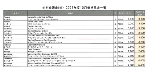 平素より【ルッコリーナオンラインショップ】をご利用頂き有難うございます。 心より御礼申し上げます。 さて、ご愛顧頂いております弊社イタリアワインにつきまして下記の通り価格改定のお知らせをさせて頂きます。 イタリア現地の仕入原価の上昇、輸送コストの上昇、大幅な円安が続き、その都度弊社も企業努力を重ねて参りましたが、単独での努力では抗し難い状況になってきております。 つきましては大変不本意で御座いますが、来たる2025年10月1日納品分より商品の価格改定をさせて頂きたくお願い申し上げます。 お客様にはご負担をおかけすることになり誠に恐縮ではございますが、 今後とも変わらぬご愛顧を賜りますよう何卒お願い申し上げます。 【改定内容】 1. 対象商品 11アイテム 2. 実施期間 2025年10月1日(水)ご納品分より適応